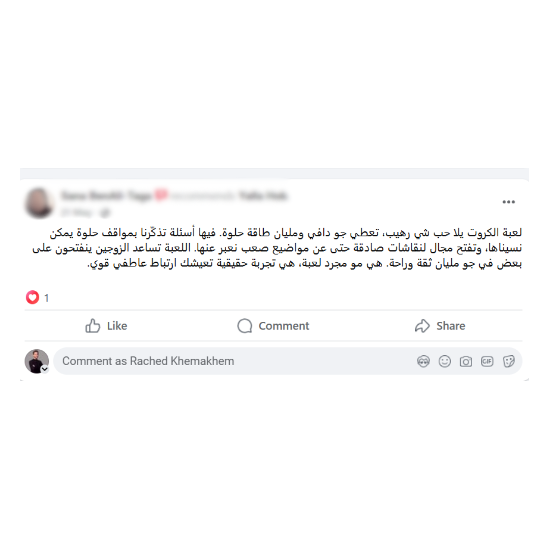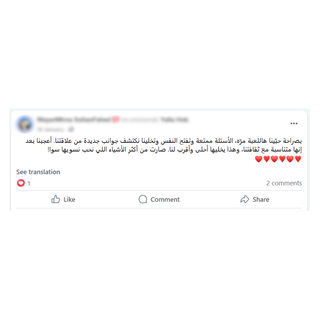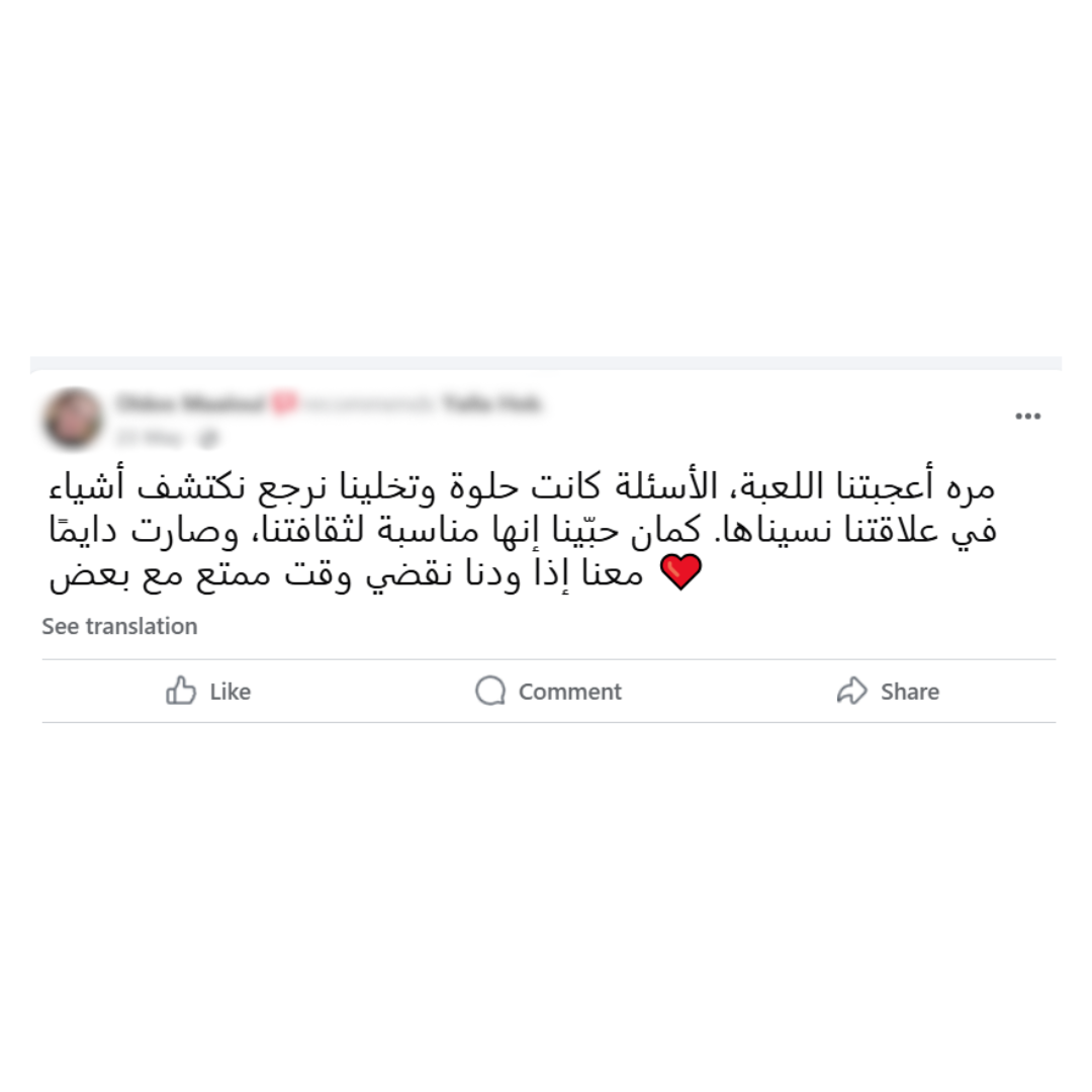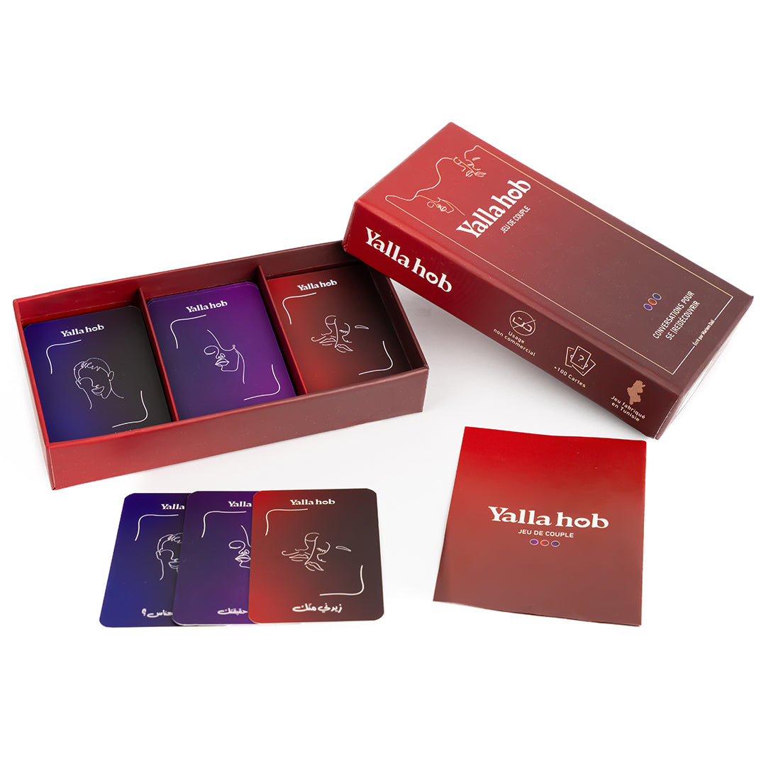 يلا حب مو بس لعبة، هي تجربة يومية ترجع الحب، الضحك، والحوار لعلاقتكم. في عالم كله ركض، نطلب منكم شيء واحد: خمس عشرة دقيقة في اليوم. تاخذون كرت، تجاوبون، تضحكون، وتكتشفون بعض من جديد